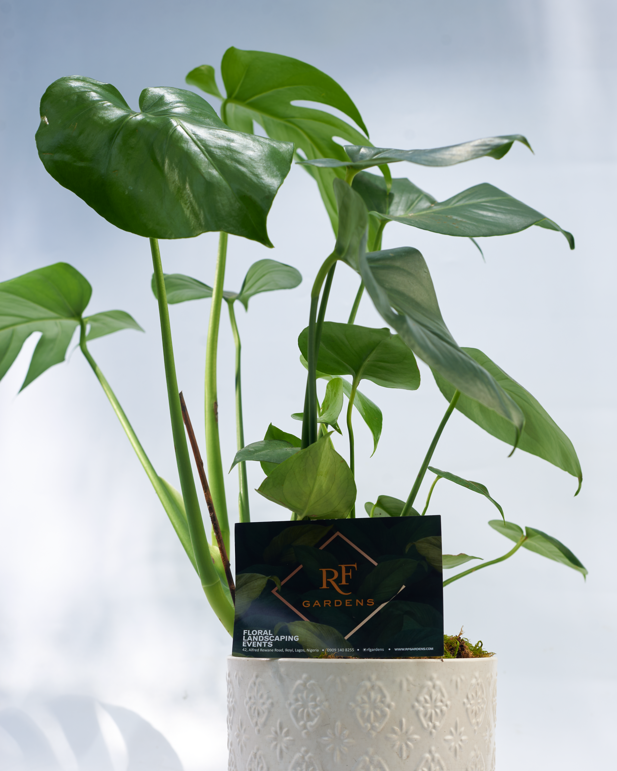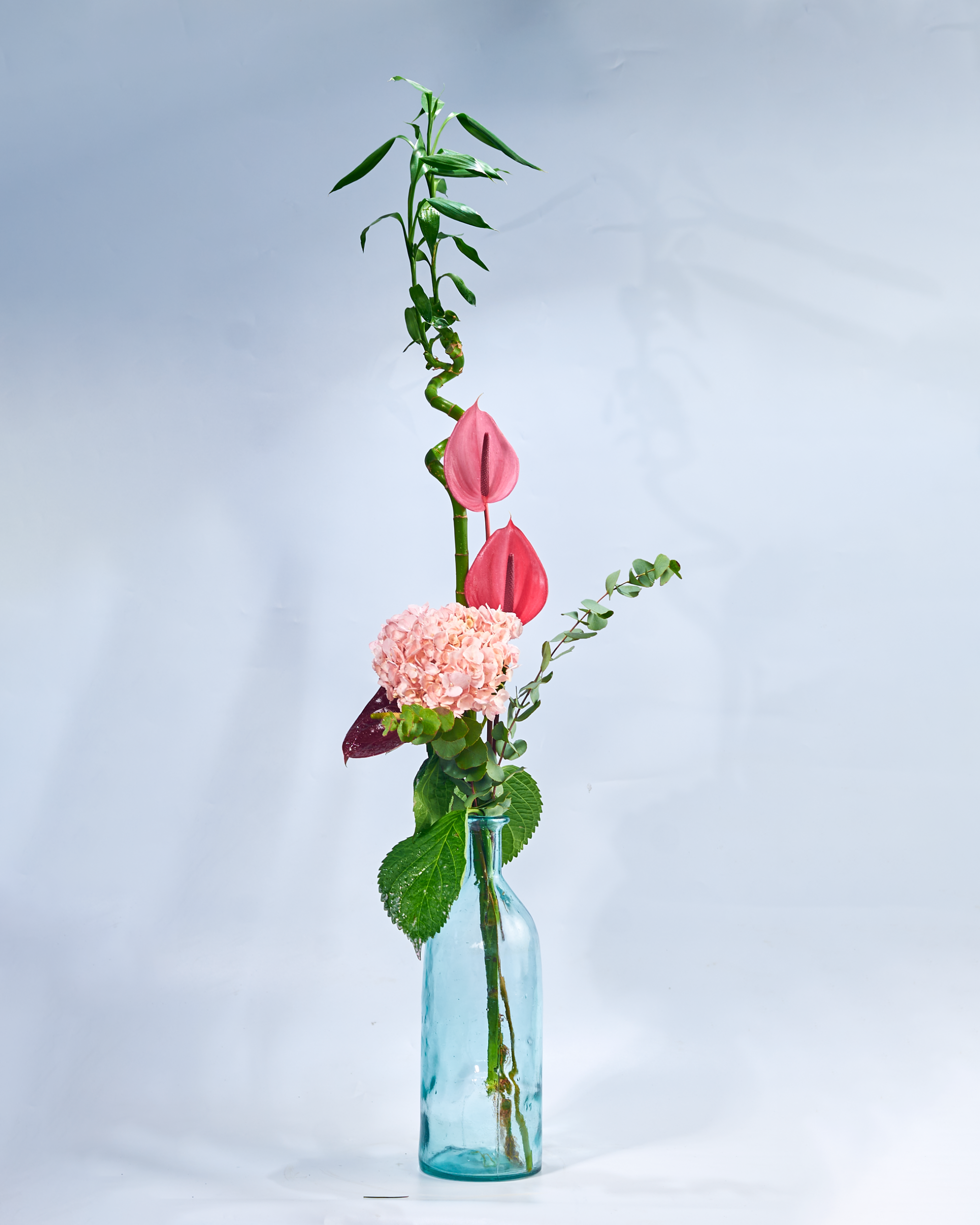 Creative arrangement with bamboo stalks, anthuriums and other seasonal blooms